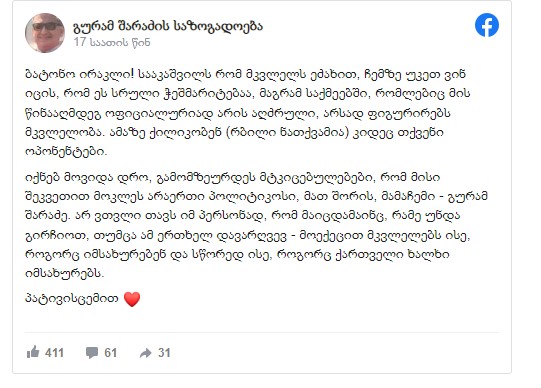 აკადემიკოს, გურამ შარაძის ქალიშვილი, რუსუდან შარაძე სოციალური ქსელის მეშვეობით „ქართული ოცნების“ თავმჯდომარეს, ირაკლი კობახიძეს მიმართავს.